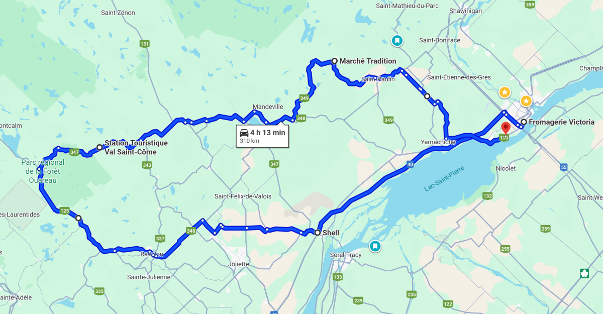 16h00: Arrêt de 15 minutes à Saint-Alexis (Marché Tradition, 450 Rue Notre Dame, Saint-Alexis-des-Monts, QC J0K 1V0)